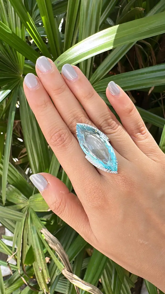 0.66 Ct. Round Cut Diamond Wedding Ring - 18k White Gold & 29.29 Ct. Aquamarine Gemstone Ring