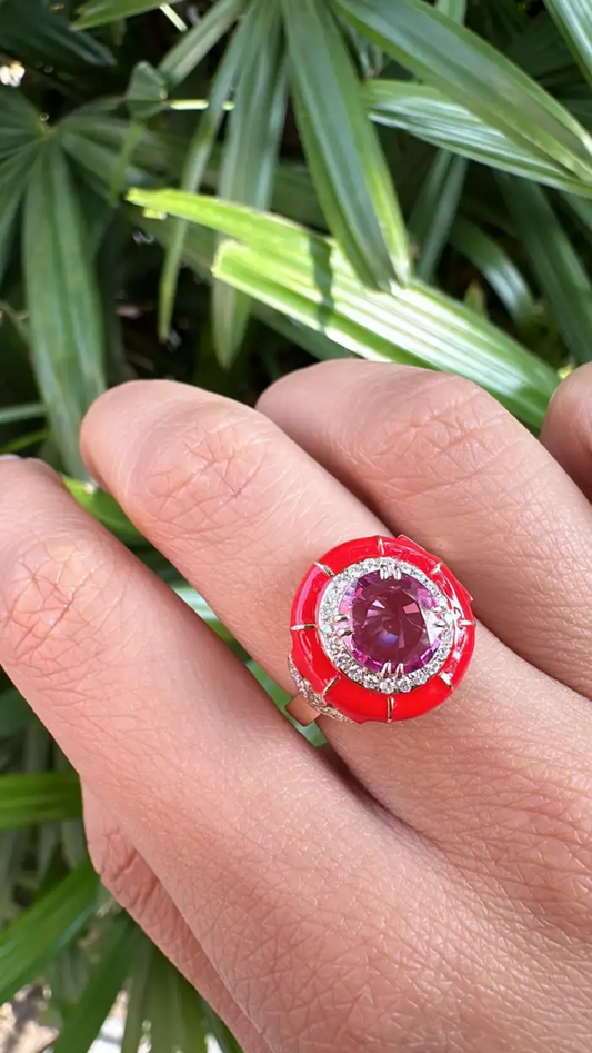 18k Gold Diamond Minimalist Ring - Natural Pink Sapphire & Red Enamel Ring - Party Wear Ring