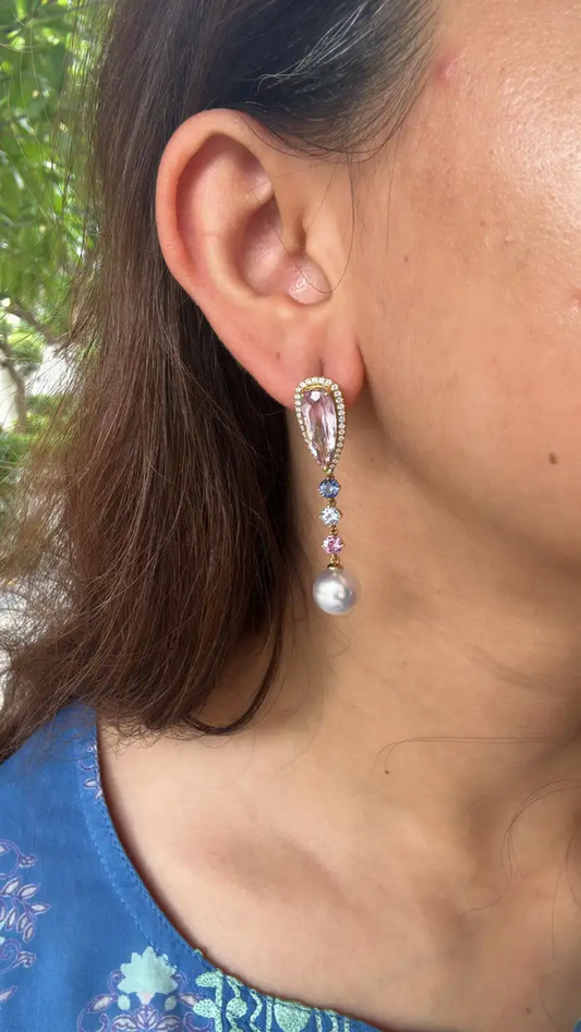 14.32 carat, Kunzite, Multi Sapphire, South Sea Pearl & Diamonds Dangle Earrings