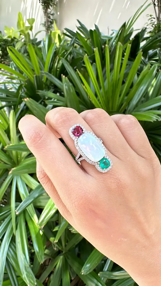 0.84 Ct. Round Cut Diamond 18k White Gold Wedding Ring Natural Ethiopian Opal, Zambian Emerald & Rubellite Gemstone Jewelry Gift