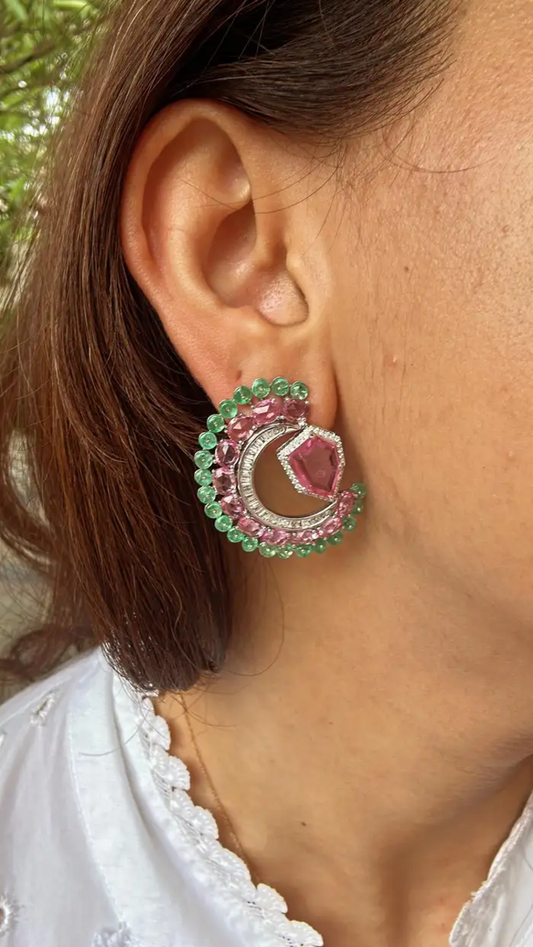 11.33 Ct. Pink Sapphire & Emerald Gemstone Stud Earrings - 18k White Gold Diamond Earrings