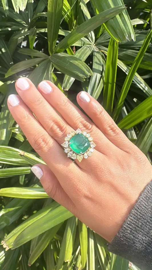 18K Gold, 12.60 carats, Zambian Emerald & Yellow Diamonds Cocktail Ring