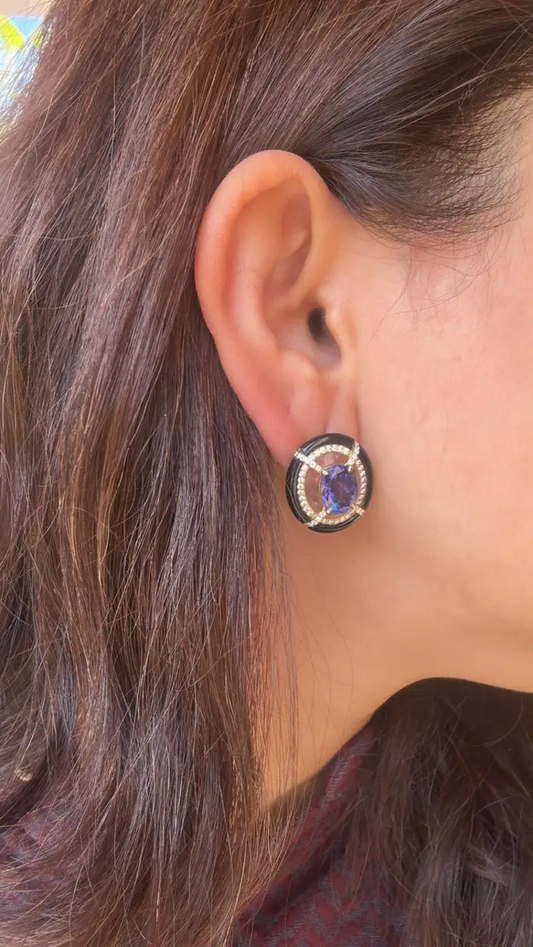 18k Gold Diamond & Tanzanite Gemstone Stud Earrings - Rock crystal & Black Onyx Earrings
