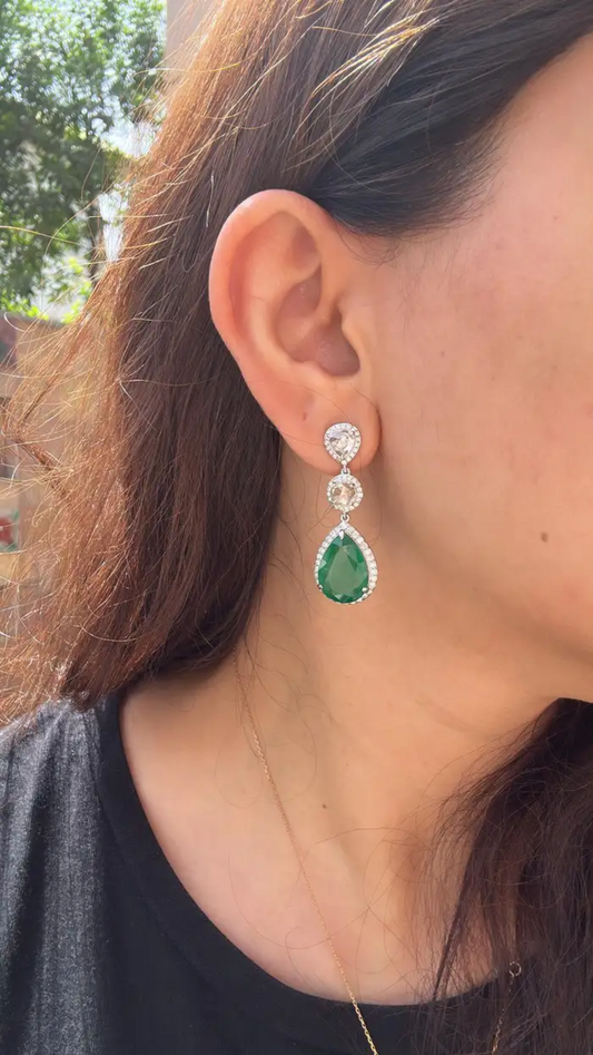 12.36 Ct. Natural Zambian Emerald Dangle Gold Earrings - 18k White Gold & Rose Cut Diamond Earrings