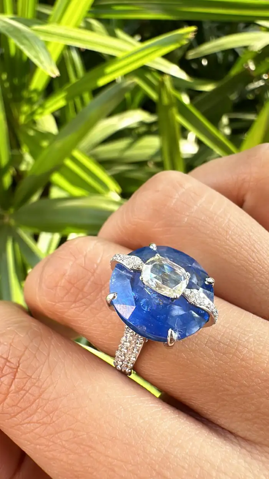 13.38 Ct. Round Cut Blue Sapphire Gemstone Ring - 18k White Gold Wedding With Rose Cut Diamonds