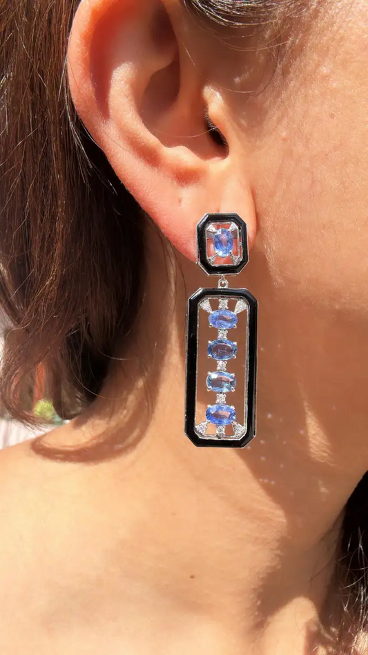 5.59 Ct. Oval Cut Ceylon Blue Sapphire 18k White Gold Earrings - Natural Diamond & Black Onyx Dangle Earrings
