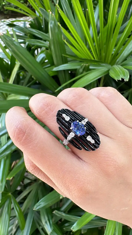 Black Onyx & Tanzanite Gemstone Ring - 18k White Gold Diamond Cocktail Ring