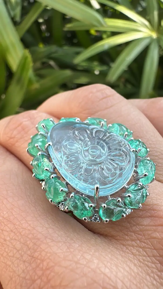 Carved Aquamarine & Zambian Emerald Cocktail Ring - 18k White Gold Handmade Diamond Ring