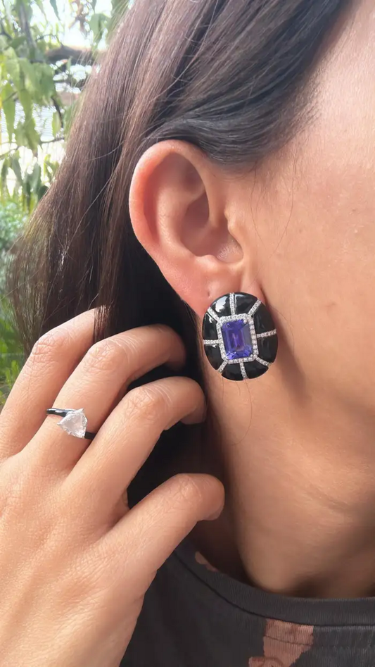 9.24 Ct. Natural Tanzanite Stud Earrings - 18k White Gold Handmade Earrings - Gold Diamond Women Earrings - Black Onyx Earrings