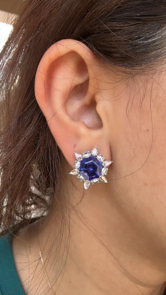 9.83 Ct. Natural Tanzanite Gemstone Minimalist Stud Earrings - 18k White Gold Rose Cut Diamonds Star Earrings - December Birthstone Earrings
