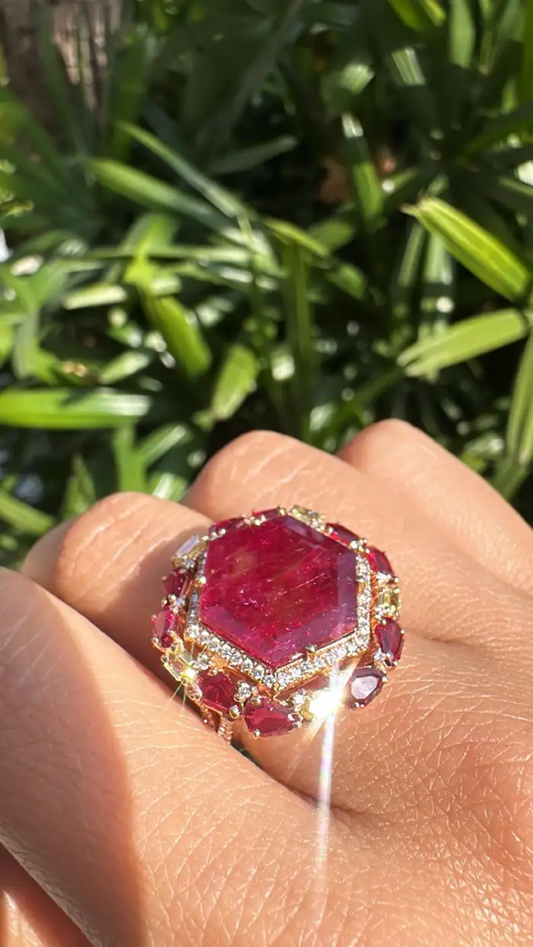 9.06 Ct Mozambique Ruby Cocktail Ring - 18k Yellow Gold Handmade Yellow Diamond Wedding Ring