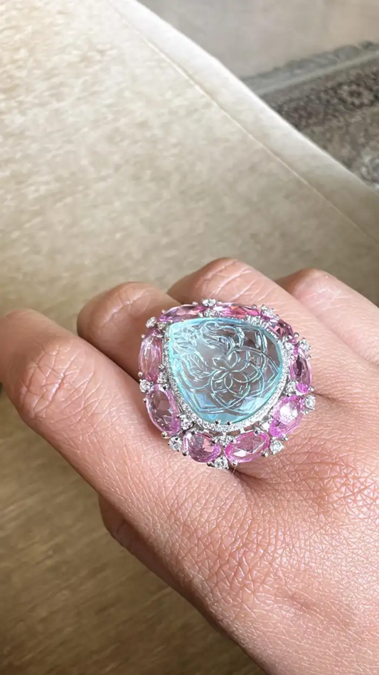 Carved Aquamarine & Pink Sapphire Gemstone Handmade Ring - Solid 18k White Gold Diamond Statement Ring