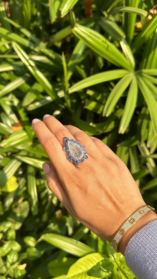 Carved Aquamarine Gemstone Ring - 18k White Gold Handmade Cocktail Ring - Natural Blue Sapphire Women Ring