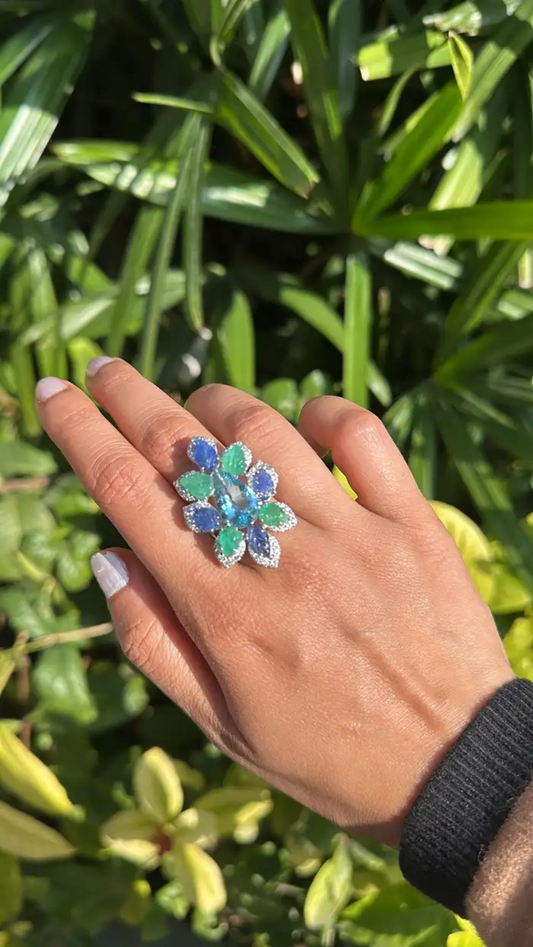 Aquamarine, Blue Sapphires, Emeralds & Diamonds Cocktail Ring - 18k White Gold Diamond Statement Ring