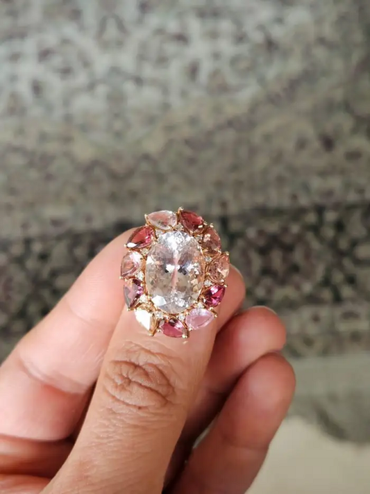 8.47 Ct. Morganite & Tourmaline Gemstone Cocktail Ring - 18k Yellow Gold Diamond Ring