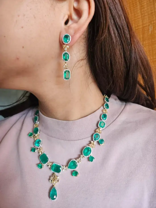 84.76 carats, Zambian Emeralds & Yellow Rose Cut Diamonds Necklace & Earrings
