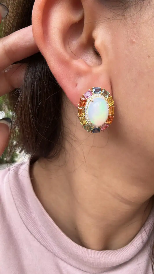 Ethiopian Opal & Ceylon Multi Sapphire Stud Earrings - 18k Yellow Gold Diamond Earrings