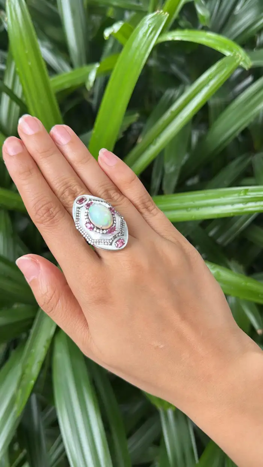 Ethiopian Opal, Mother Of Pearl & Pink Sapphire Cocktail Ring - 18k White Gold Diamond Statement Ring