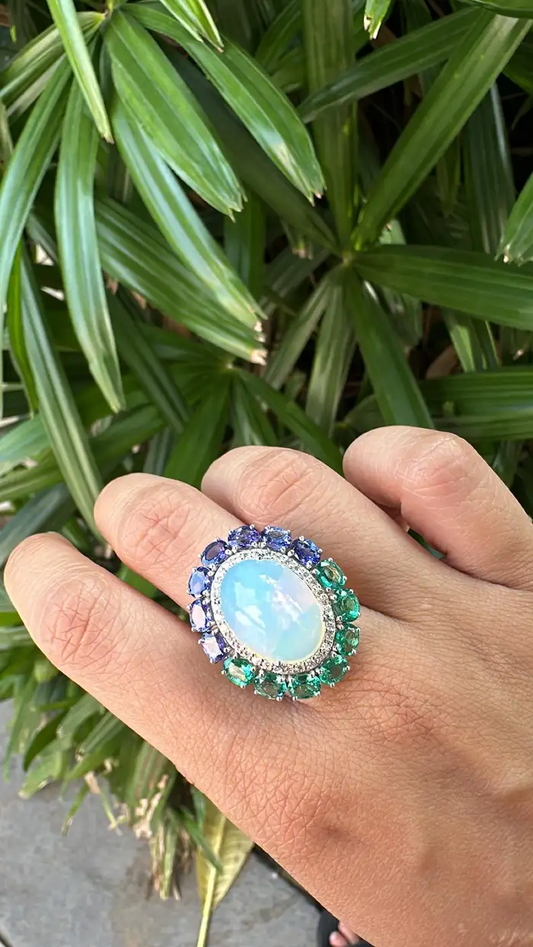 Gold Diamond Ring | 18k White Gold Zambian Emerald Ring | Tanzanite & Ethiopian Opal Cocktail Ring | Handmade Gold Diamond Ring