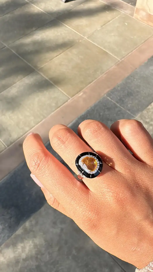 Ceylon Yellow Sapphire & Black Enamel Tiny Ring - 18k White Gold, Diamond Handmade Ring