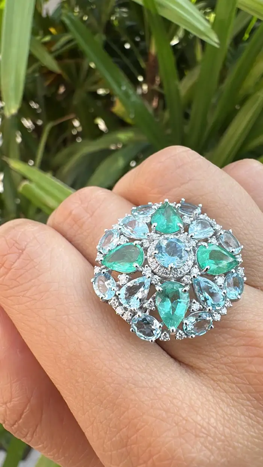 Colombian Emerald & Aquamarine Gemstone Statement Ring - 18k White Gold Diamond Cocktail Ring