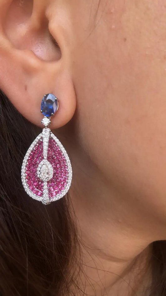 Ceylon Pink Sapphire & Ruby Gemstone Earrings - 18k White Gold & Rose Cut Diamond Dangle Earrings