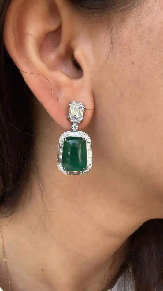 Emerald Cabochons & Diamonds Dangle Earrings - 18k White Gold Handmade Women Earrings