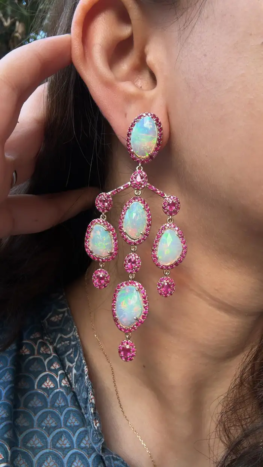Ethiopian Opal & Mozambique Ruby Chandelier Earrings - 18k Gold Diamond Dangle Earrings