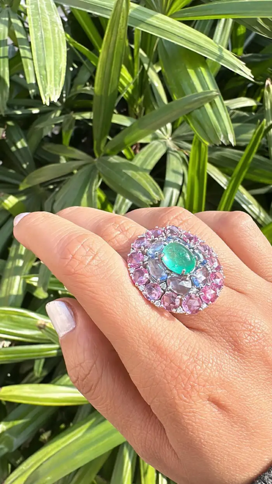 Colombian Emerald & Diamond Cocktail Ring - 18k White Gold Pink & Blue Sapphire Statement Ring