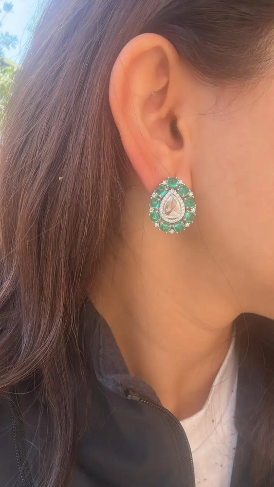 Colombian Emerald Sugarloaf & Rose Cut Diamond Stud Earrings - 18k White Gold Handmade Tiny Earrings