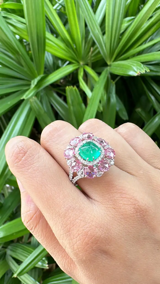 Colombian Emerald Sugarloaf, Pink Sapphires & Rose Cut Diamonds Cocktail Ring - 18k White Gold Ring