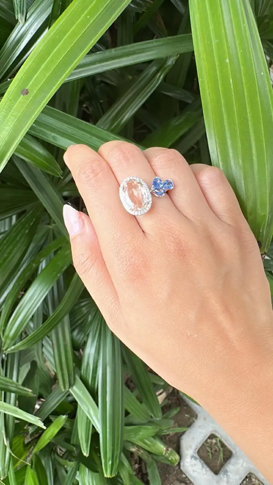Natural Morganite, Blue Sapphire & Diamond Cocktail Ring - 18k White Gold Diamond Ring