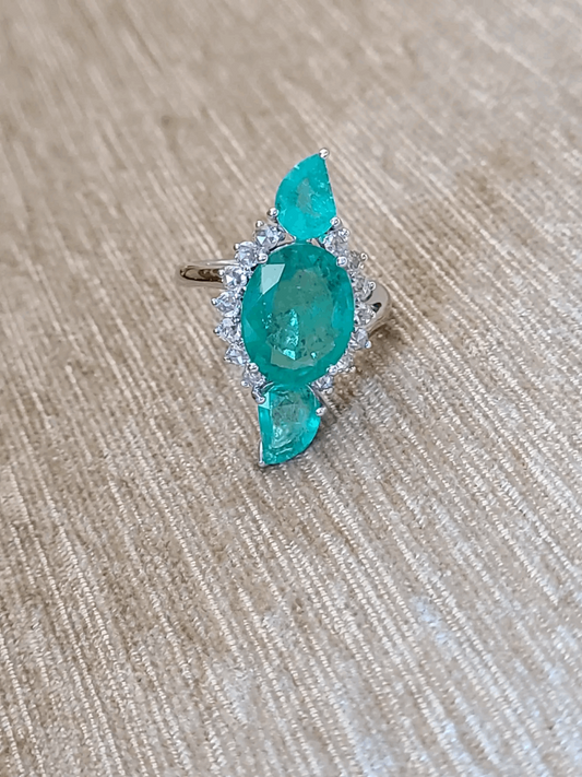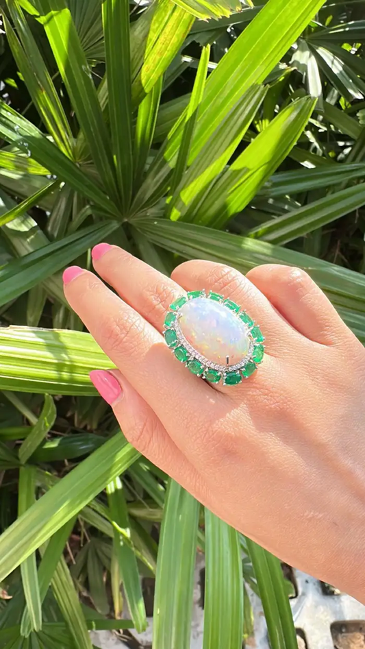 Natural Ethiopian Opal & Zambian Emerald Cocktail Ring - 18k White Gold Diamond Wedding Ring