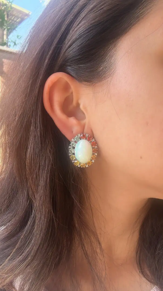 Natural Ethiopian Opal & Multi Sapphire Stud Earrings - 18k White Gold Diamond Earrings