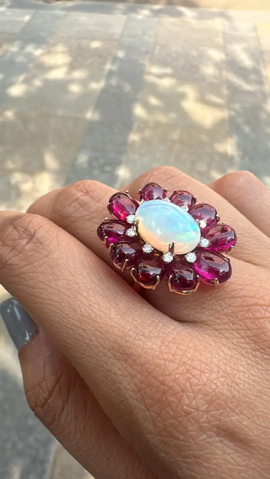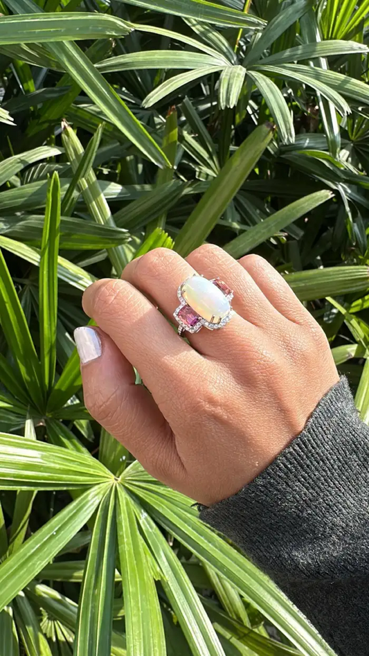 Natural Ethiopian Opal & Rubellite Statement Ring - 18k White Gold Diamond Women Ring