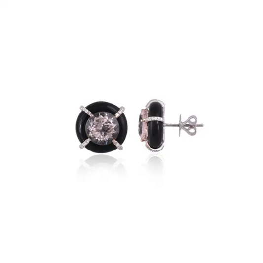Natural Morganite & Black Onyx Stud Earrings - 18k Gold Diamond Round Tiny Stud Earrings