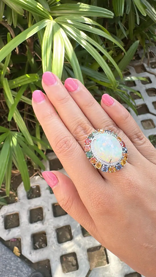 Natural Ethiopian Opal 18k White Gold Statement Ring - Ceylon Multi Sapphire & Diamond Wedding Ring