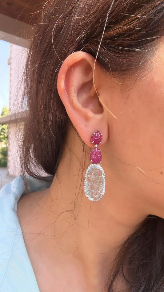 Natural Mozambique Ruby & Aquamarine Gemstone Dangle Earrings - 18k White Gold Diamond Earrings