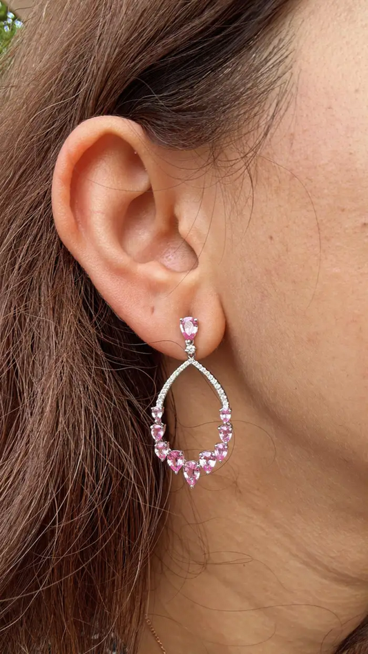 Natural Pink Sapphire Dangle Earrings - 18k White Gold Handmade Diamond Women Earrings