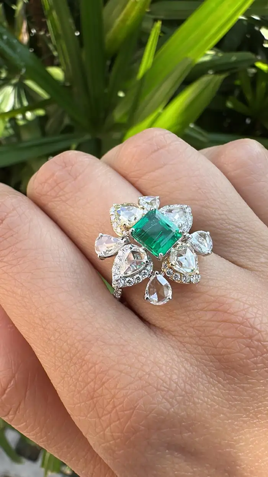 Natural Rose Cut Diamond Cocktail Ring - 18k White Gold Zambian Emerald Wedding Ring