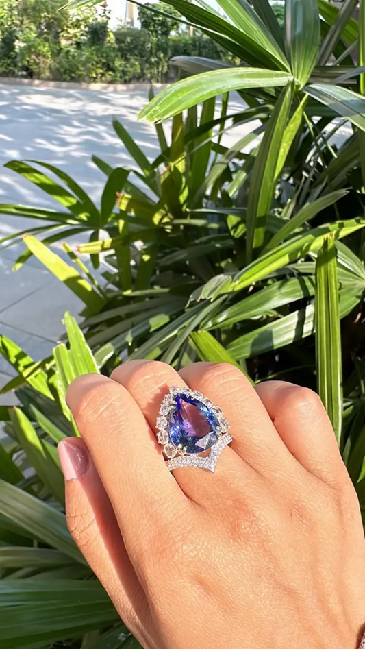 Natural Pear Tanzanite Gemstone Statement Ring - 18k White Gold Rose Cut Diamonds Women Ring