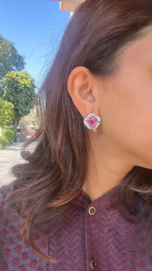 Natural Rubellite & Rose Cut Diamond Stud Earrings Made in 18k White Gold