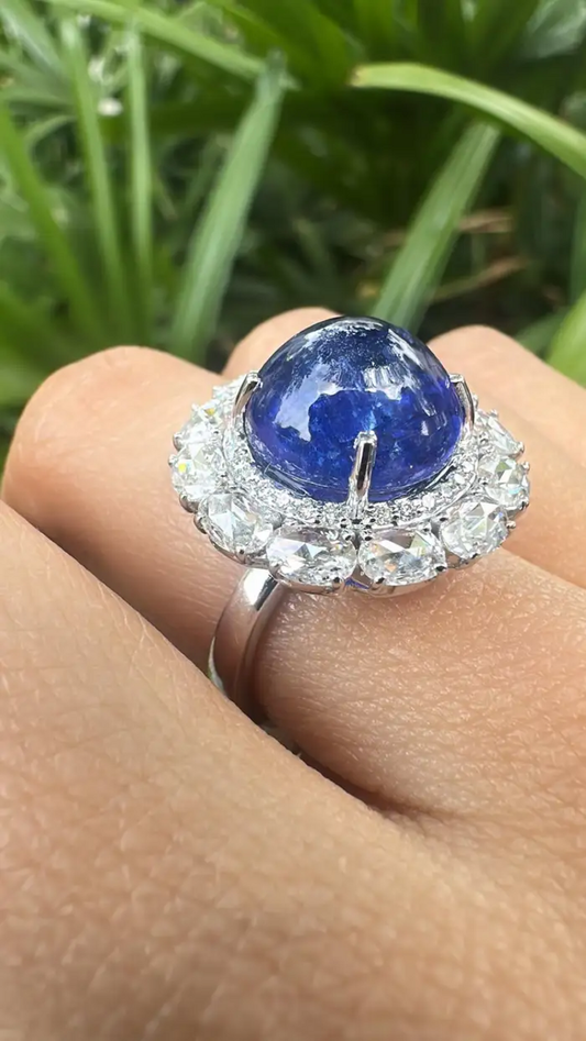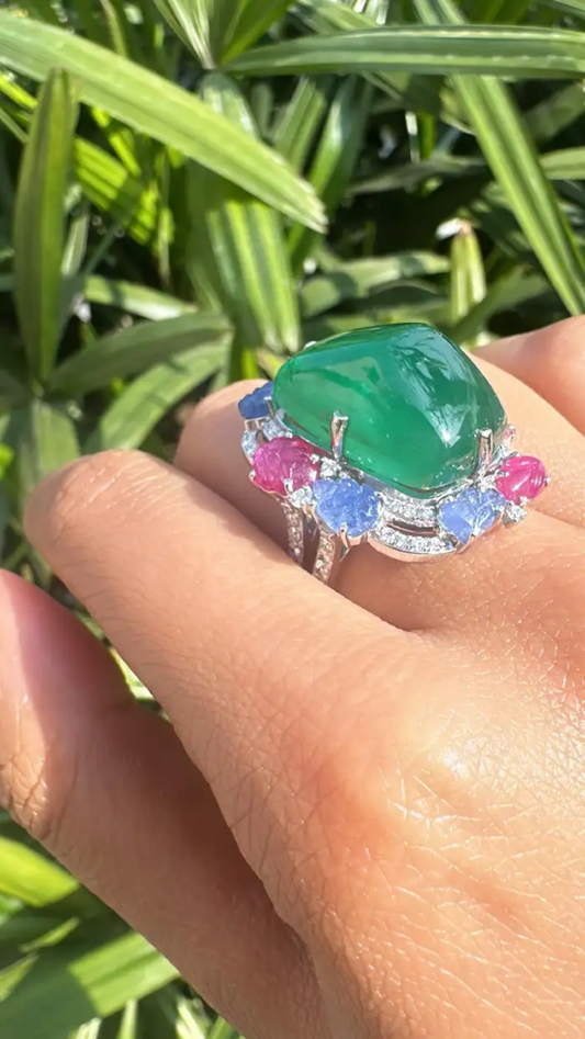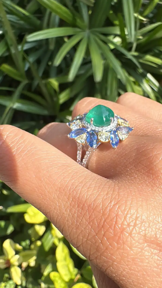 Natural Sugarloaf Emerald & Diamond Ring - 18k White Gold Cocktail Ring - Carved Blue Sapphire & Ruby Wedding Ring