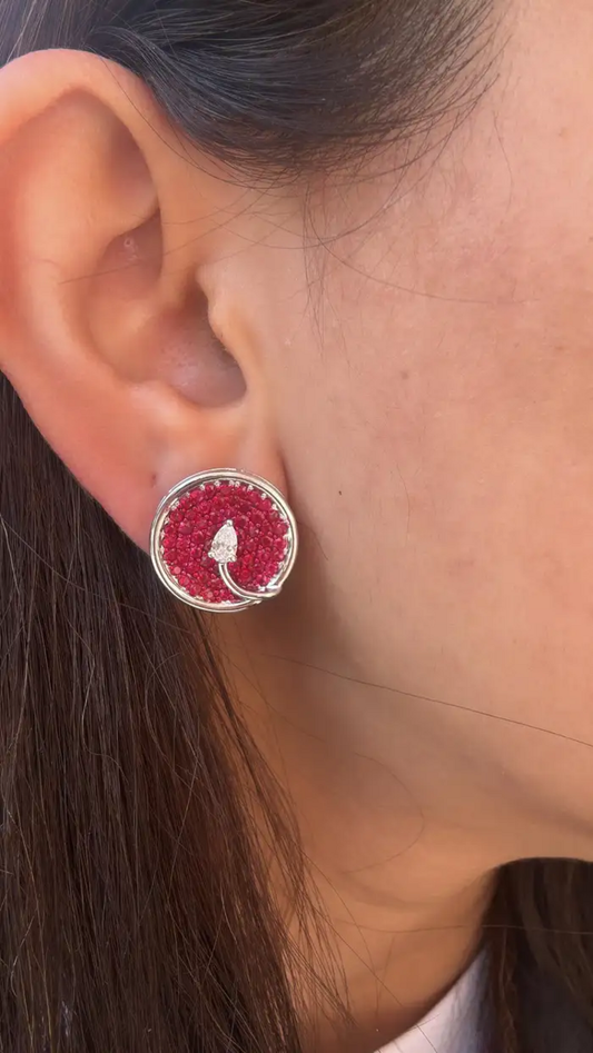 Natural Ruby Gemstone Round Stud Earrings - 18k White Gold Diamond Tiny Earrings