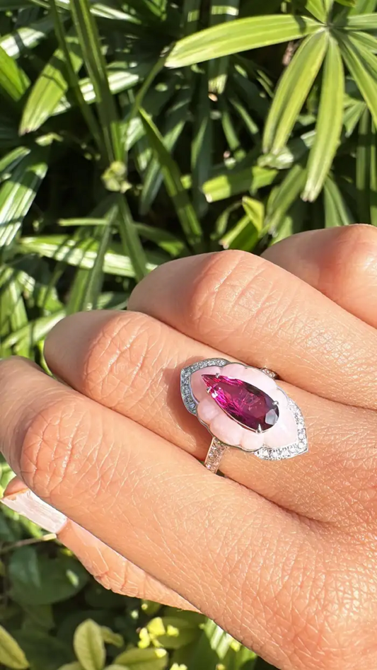 Natural Rubellite & Pink Opal Wedding Ring - 18k White Gold Handmade Diamond Ring