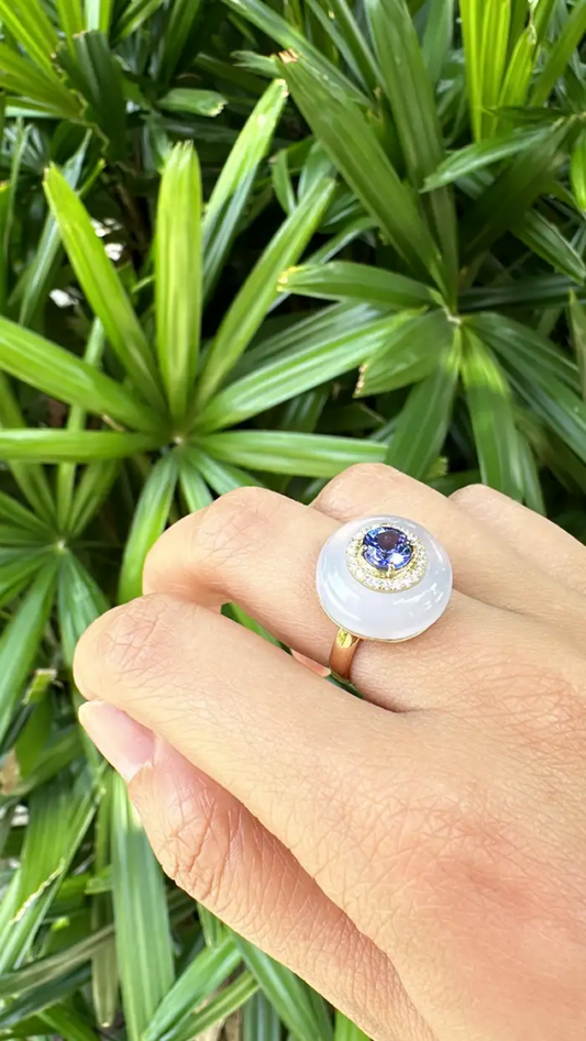 Natural Tanzanite & Chalcedony Gold Ring - 18k Yellow Gold Diamond Cocktail Ring