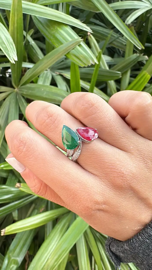 Natural Pear Shape Zambian Emerald & Mozambique Ruby Wedding Ring - 18k White Gold Diamond Ring