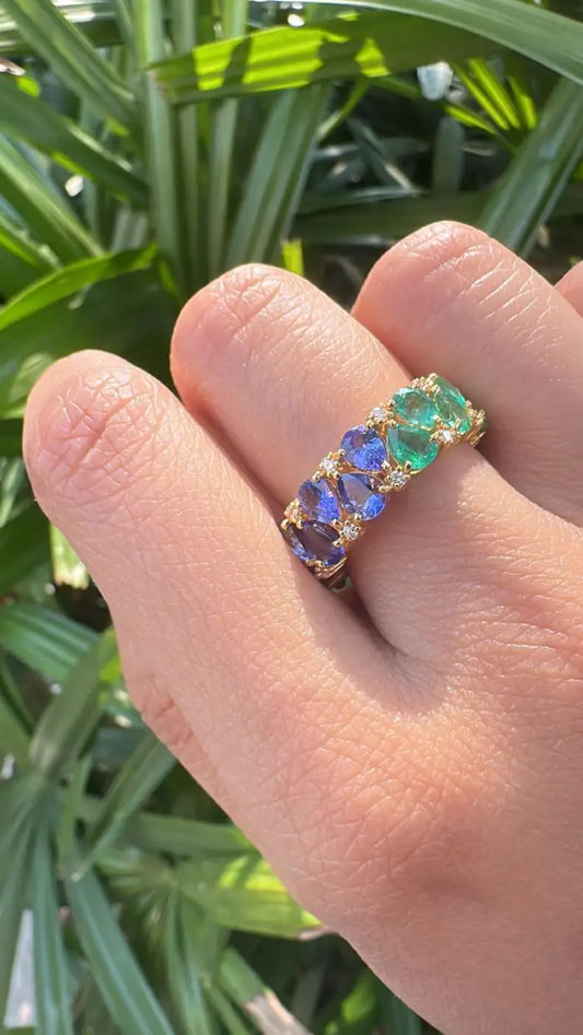 Natural Pink Sapphire, Zambian Emerald & Tanzanite Band Ring - 18k Yellow Gold Diamond Wedding Ring