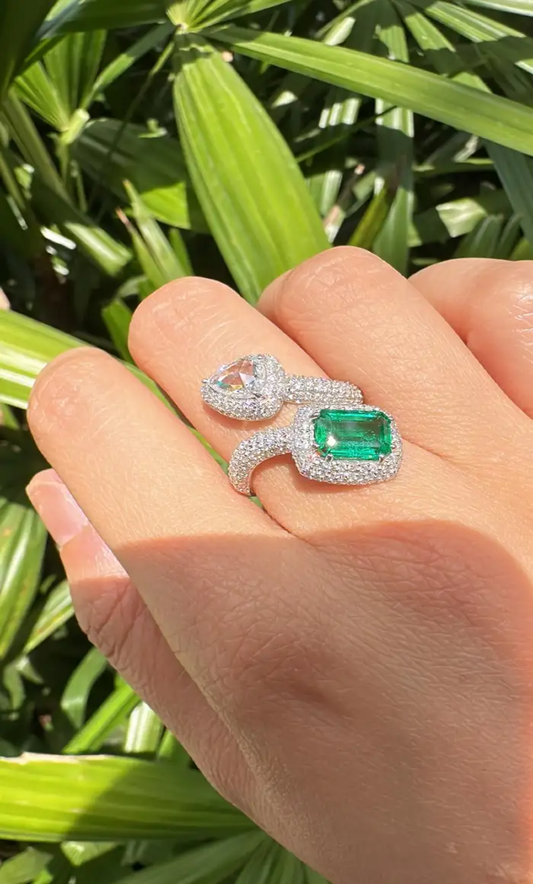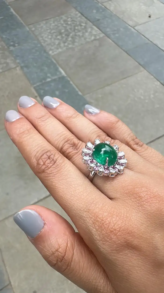 Solid 18k White Gold Handmade Cocktail Ring - Natural Zambian Emerald & Pink Sapphire Ring