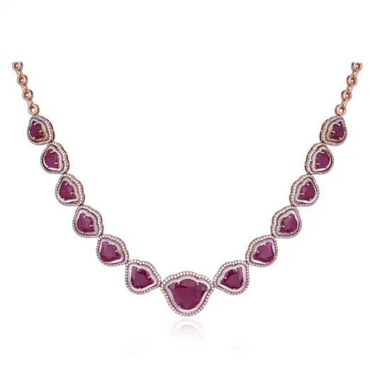 Tulip cut Mozambique Ruby & Mother Of Pearl Necklace Earrings Set - 18k Rose Gold Diamond Necklace Earrings